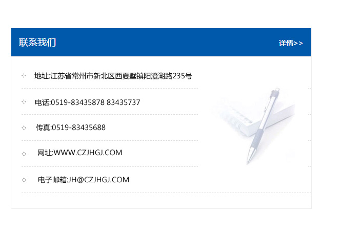 地址:常州市新北區友邦商務大廈1幢16、17層  電話:0519-85101652  傳真:0519-85112595  郵編:213022  網址:www.cz-jiayue_cn.lm1168.com  郵箱:xiajifengaa@163.com